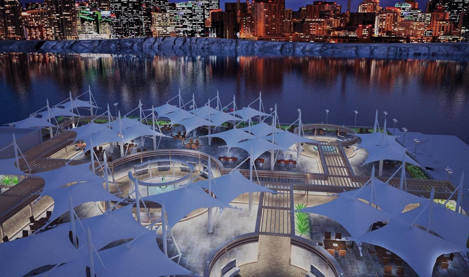 The Waterfront Terrace Restaurant is a versatile dining space designed to seat 180 guests, catering to a variety of dining preferences. From intimate 2-person booths to larger group seating, the layout ensures a comfortable and enjoyable experience for all. The design seamlessly blends indoor and outdoor elements, featuring shaded decks and calming water features to create a serene and inviting atmosphere.